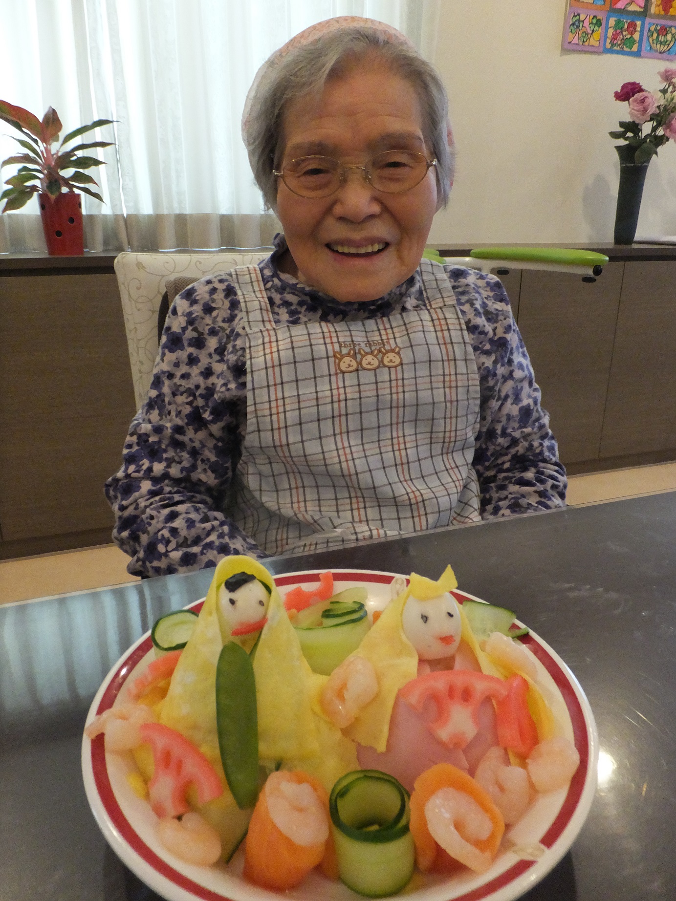 蓮音~すてきなひな祭り~ 医療法人はるにれ|お知らせ 掲載日:2016.03.15 3月3日はひな祭り ❤ 今回はどんなことをしたかと言いますと、お昼のちらし寿司を皆で作りました!でも~~ 普通のちらし寿司ではなくて 『デコちらし』を作りました ♪ きゅうりを薄~く長~く切ってみたり ご飯を器に入れてひっくり返してみたり サーモンを丸めてみたり 一体どんなちらし寿司ができるのでしょ~か~ (*^^) じゃ~んこんなのできました ✿ 見てください!お内裏様とお雛様です!!! どこから食べるの?としばらく残していた方や 眺めていた方が多かったです ☆彡 でもですね、調理に時間と体力をかけてしまい 「食べる前に疲れたね」なんて声も (涙) そのかわり 3時のおやつには歌を歌って甘酒や桜餅を食べてゆっくりしました ♡