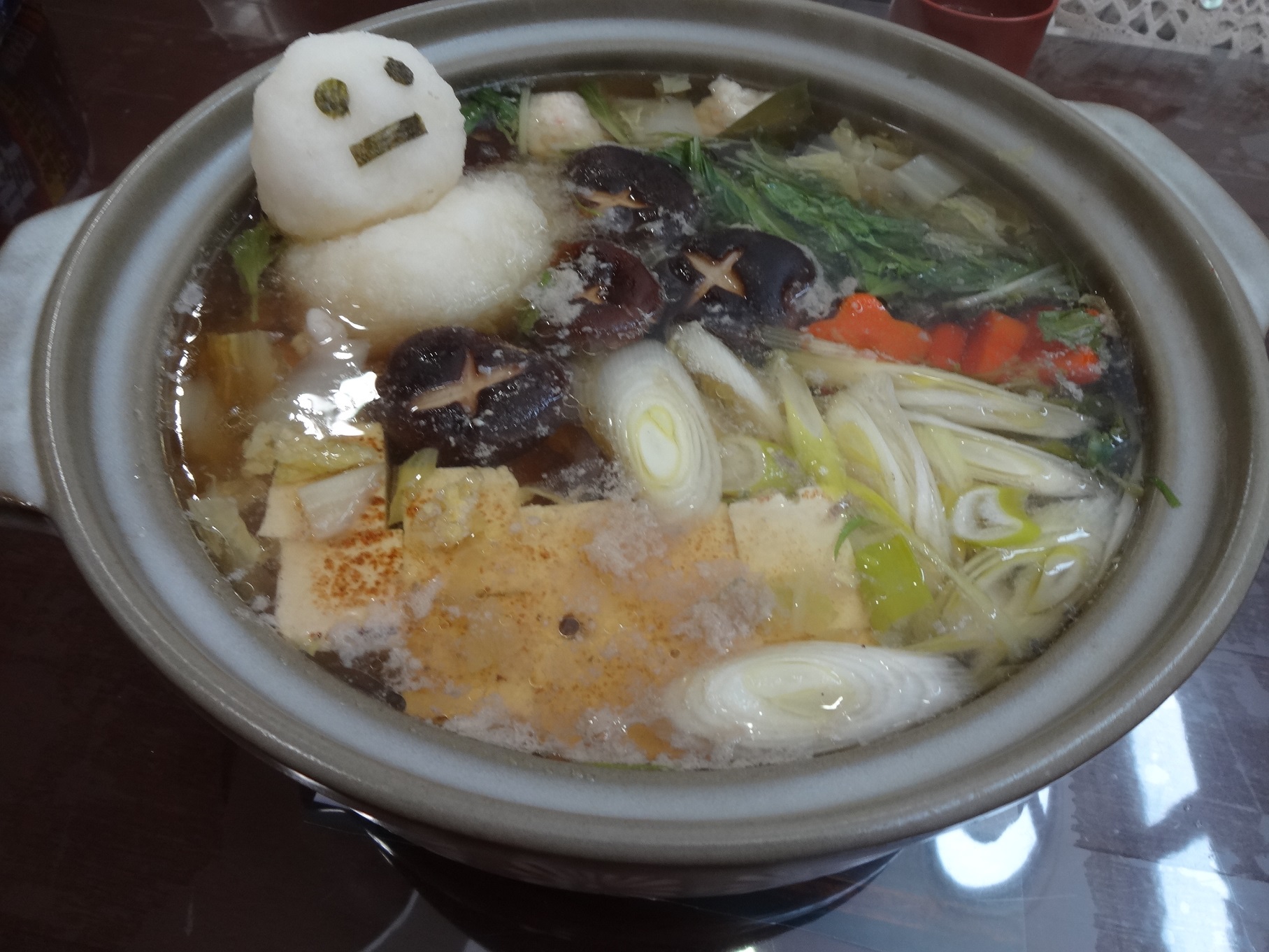 きらり~ほっこり鍋~ 介護付有料老人ホームきらり|お知らせ 掲載日:2016.04.04 3月18日の昼食はお鍋シリーズ第3弾!! たっぷり野菜とおいしいつみれがたーくさん☆ 鍋シリーズの〆は、ほっこりみぞれ鍋でした。 ほっこりの理由は・・・・ 大根おろしでつくった雪だるま。 憎めないこの表情。ちょっぴり癒しを感じませんか?! 大根にはアンチエイジングの効果やダイエットの効果が あるみたいです!! (この日大根おろしを夕食に食べた職員が多かったとか・・・) 雪だるま投入!! 温泉に入っているみたいですよね~ 食べるときに崩そうとしたら、入居者さんから 「かわいそうよ~(*_*)」「崩さないであげて~」 そんな声があがりました。 おいしいお鍋でみなさん箸がよくすすんでいました!! 気づけばお鍋の中の雪だるまもいなくなり・・・・ 外の雪もすっかり溶けもうすぐ春ですね☆ 春がまちどうしいですね(*^_^*)