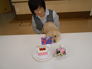 【花音】カノン君が5歳を迎えました^^ 介護付有料老人ホーム花音|お知らせ 掲載日:2016.06.21 5月23日には、花音が5周年を迎えました。 6月13日は、カノン君の5歳の誕生日です♪ なかなか『静かにすること』を覚えないカノン君ですが、(人間でいうと)立派な大人なんです☆ 入居者の皆さんと カノン君クッキーを作ったんです♡ (今回は、完成から見せちゃいます♡) 素晴らしい出来でしょ?? 生地を混ぜたり、こねたり・・・ 体温で、生地が柔らかくなってしまい・・・ やり直し(◎_◎;) そんなハプニングもありましたが、 「ワハハ」「ワハハ」と 楽しみながら作りました♪ カノン君には、苺のケーキが!! 美味しそうです・・。 人間が食べるケーキと変わらない見た目ですよね♪ 待てません・・・。 「早く!早く食べさせてぇぇぇぇえぇぇぇぇぇぇぇっっ!!!」 いっぺんに食べると、お腹を壊しちゃうかもしれないので、 今日は一切れだけ。 しせつちょーの「待て」に辛抱強く待ちます(かわいい♡) 「よしっ!」の声に・・・いえ 「よ・・」くらいでガマンできずにパクリ。 お味が宜しいようで、むしゃむしゃ食べてました(≧▽≦*) 来年は、もうちょっと成長した姿をお見せしたいところですね(笑)