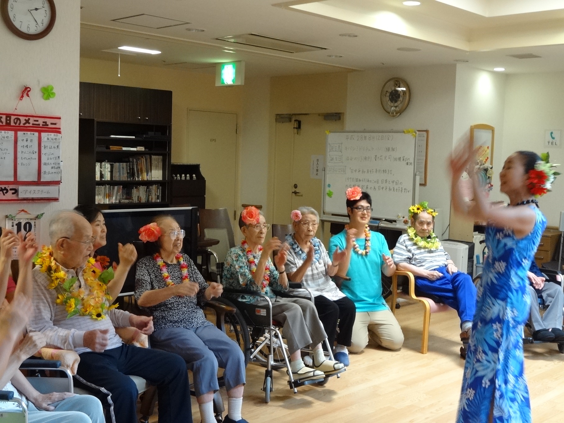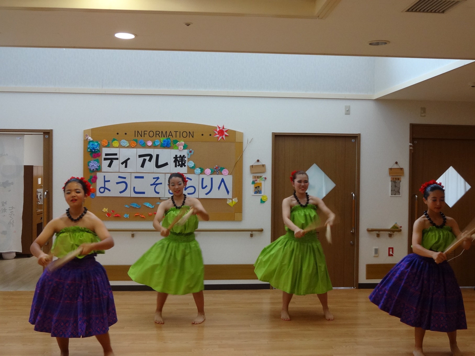 きらり~✿フラガールになりました✿~ 介護付有料老人ホームきらり|お知らせ 掲載日:2016.08.16 花飾りやレイを付けてフラガールに変身☆ 「昔ハワイに行ってフラダンス見たことあるよ」 「楽しみだわ~。」 以前来た時、小学生だった子たちも 今は中学生になりました。 大人顔負けの妖艶なフラダンスを披露してくれました。 「かわいいよ!」 「腰の動きいいね~!!」 たくさんの声援をおくっていました。 声援もノリに乗ってくると・・・・ 「ヒュ~!ヒュ~!!」 「っそれ!っそれ!!」 大いに盛り上っていました(*^_^*) 最後はみなさんでフラダンス♪ 職員の動きの方がぎこちないような・・・(+_+) フラダンスというより盆踊り?! みなさんとっても楽しそうに踊られていました☆ ティアレさんの教え方がいいからですね(*^_^*)v 最後はみんなで記念写真(^_^)v 夏の太陽のような素敵な笑顔がたくさんありました☀
