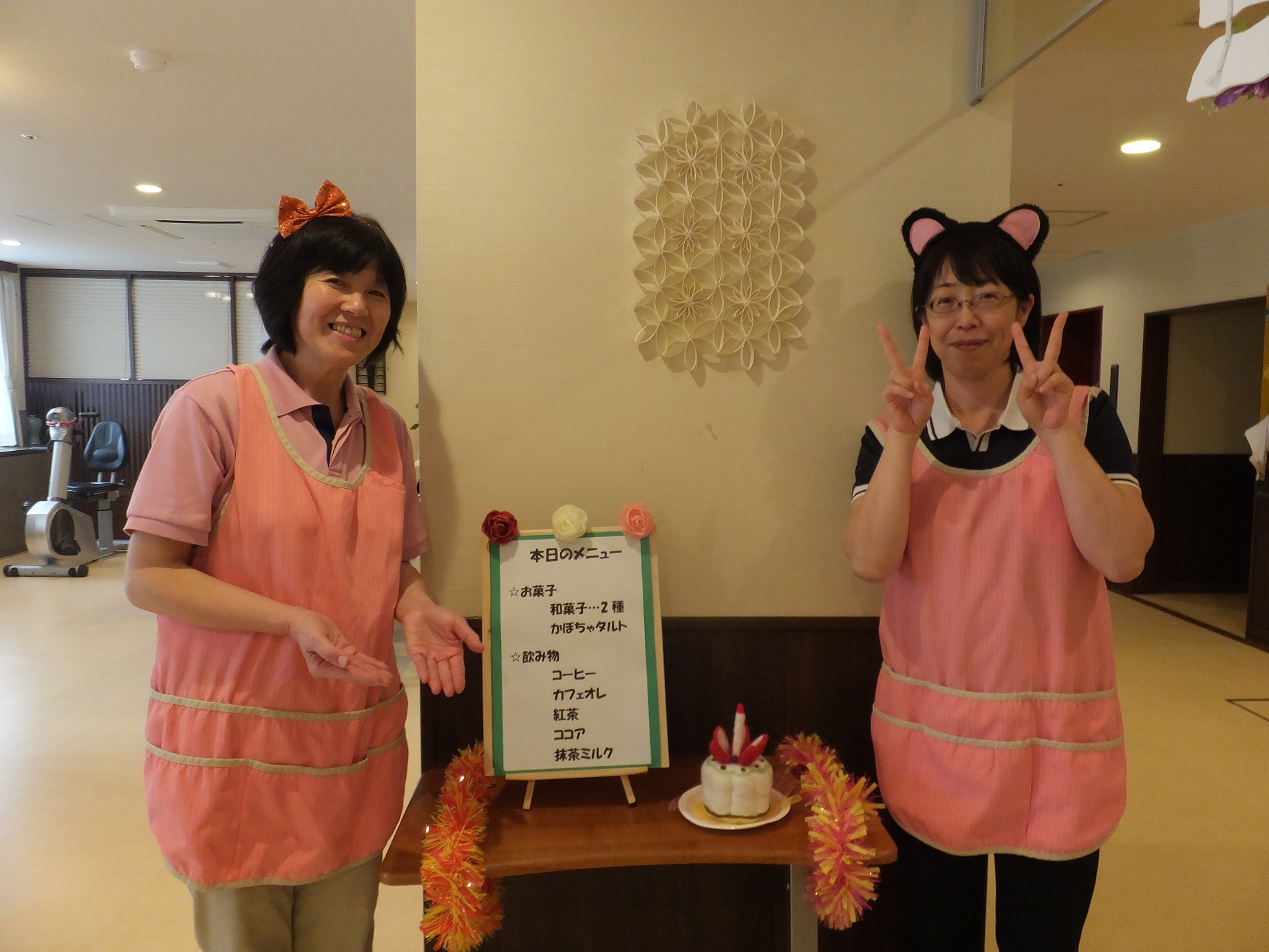 蓮音~蓮音喫茶でまったりしましょう♪~ 医療法人はるにれ|お知らせ 掲載日:2016.11.04 これから寒くなり、外に行く機会が減ります。この一冬を元気に乗り越えられるように メイド(?)仮装(?)姿の店員がいる、蓮音喫茶が1日限定でオープンしました♬ 動物や少女になり替わった職員が おいしい飲み物とケーキや和菓子 を運びますよ~ 大きなお皿に盛られたスィーツを 3個選んでもらいます!かぼちゃの タルトは今の時期にピッタリ❤ 飲み物はバリスタの美味しい カフェラテや抹茶ミルク等お好みで 選んでいただきました 職員よりもすてきに変身した 入居者さまもいましたよ~
