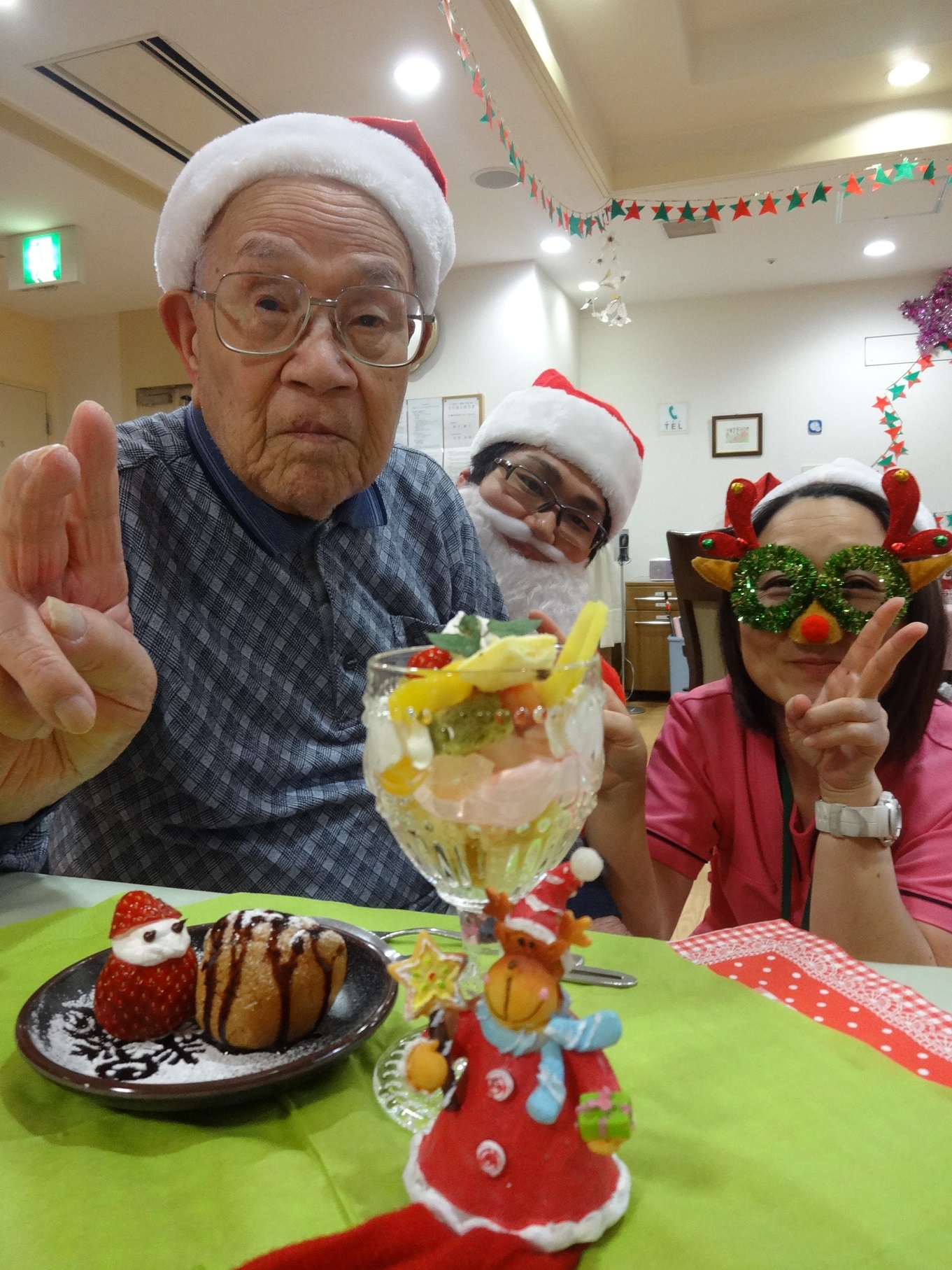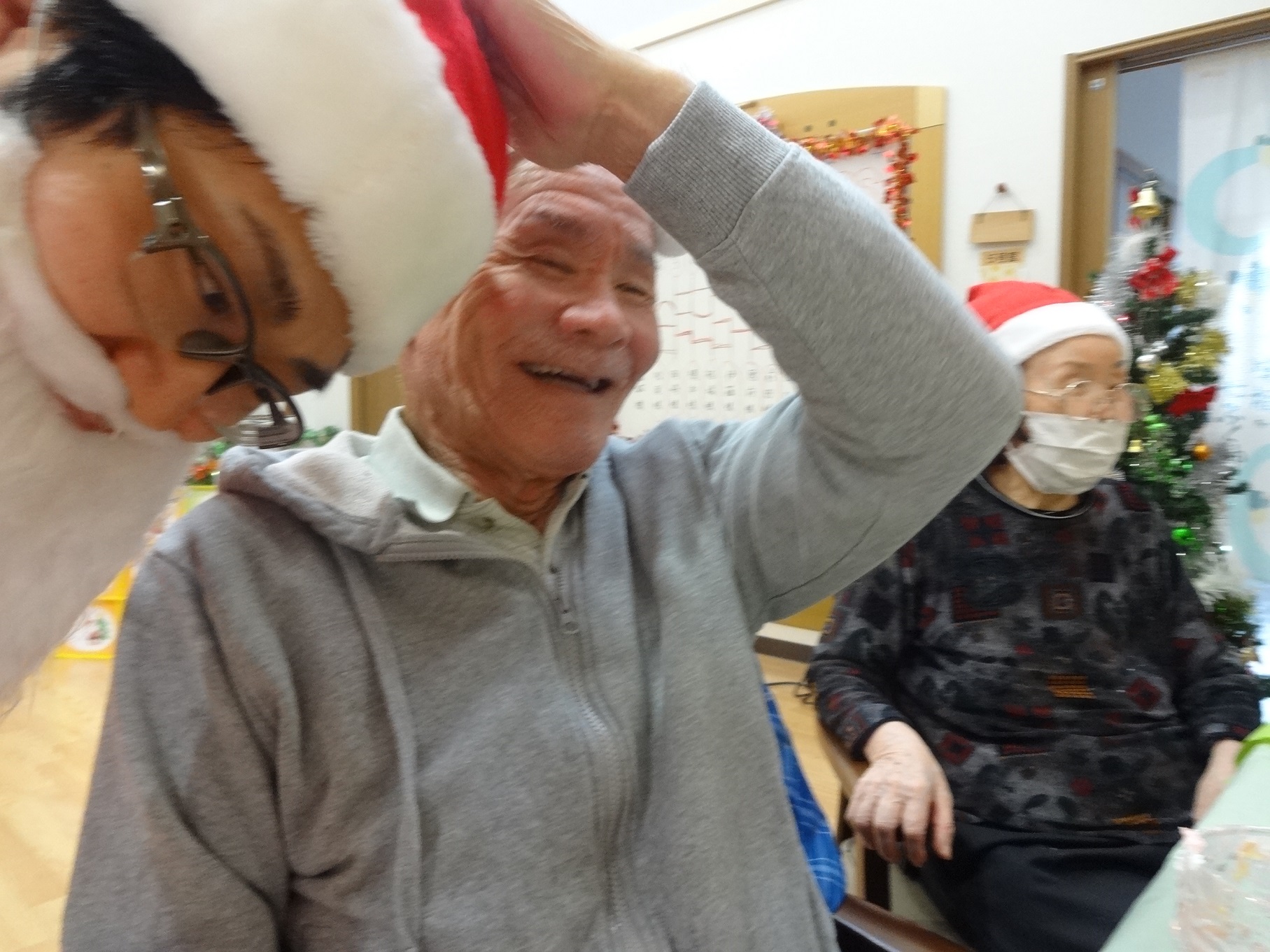 クリスマスパーティー後、入居者が職員の頭をヨシヨシと